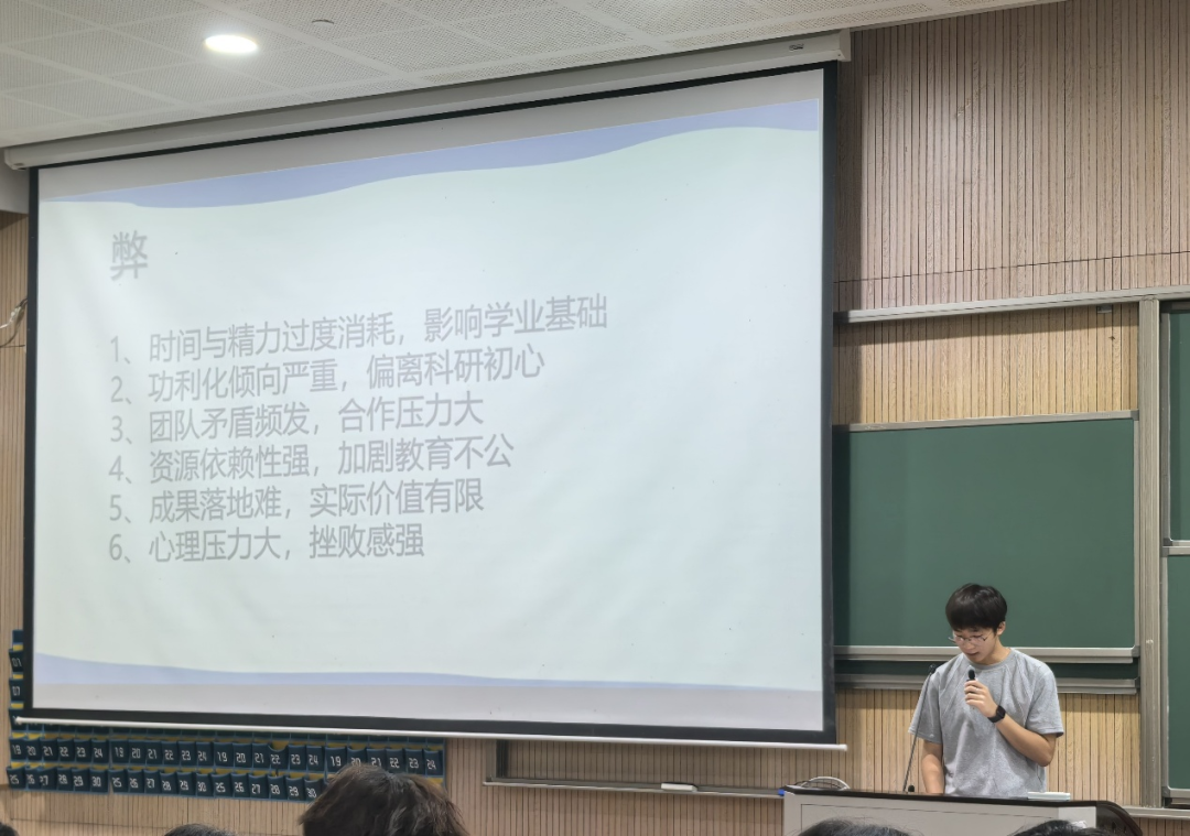 季忠豪学长聚焦学科竞赛实操,结合自身参赛经历,拆解各种大型赛事日程,从赛前准备到赛中考核细节逐一说明,同时强调大一做科研的利弊,从而让新生更好地权衡利弊。诸如此类的实用建议也让新生对竞赛落地有了清晰认知。