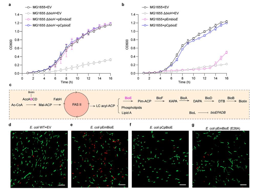 我们通过对大肠杆菌 ΔbioH 回补 CpBioE 后,发现其可以恢复在无生物素的 M9 培养基中的生长;但在野生型大肠杆菌中,仅 EmBioE 过表达则会引发生长迟缓,类似 BioC 高表达对脂肪酸合成的干扰效应。通过共聚焦显微镜的活/死染色结果显示:EmBioE 的过表达,细菌的死亡细胞(红色)显著增加,而 CpBioE 或无催化活性的 EmBioE(E26A)过表达无此影响。本研究明确:伊丽莎白菌 EmBioE 与衣原体 CpBioE 的结构、生化特征存在差异,体现 BioE 家族的遗传多样性:EmBioE 兼具促生物素合成以维持生长、过表达引代谢适应成本的双重作用,需 BioL 调控以平衡生物素合成与脂代谢;衣原体因 CpBioE 低活力且底物专一性丢失 BioL,减少脂代谢扰动。