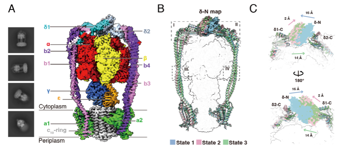 本研究以Chloroflexus aurantiacus为材料,内源分离提取出完整的ATP合酶(CaF1FO),分别解析了结合和不结合底物ADP的样品在三种旋转状态下的高分辨电镜结构,并发现了一种全新的F1FO结构特征和独特的质子跨膜转运机制。与以往报道的所有ATP合酶截然不同,CaF1FO含有2个外周茎(b1b2δ1和b3b4δ2)和2个跨膜转运质子的a亚基(图1A)。在旋转催化过程中,2个外周茎为偶联CaF1进动(precession)和c10环的旋转提供了显著的结构稳定性和构象灵活性:2个外周茎中间螺旋区域呈现出不对称的弯曲形态,以防止旋转催化过程中CaF1头部的摆动(图1B);在CaF1顶端,2个δ亚基的N端(δ-N)形成二聚体,通过显著的构象变化释放旋转过程中储存的弹性能量(图1C)。