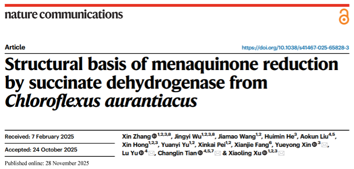 2025年11月28日,基础医学院徐晓玲教授联合生命与环境科学学院辛越勇副研究员、上海交通大学田长麟教授、中国科学技术大学于璐研究员等在Nature Communications发表了题为“Structural basis of menaquinone reduction by succinate dehydrogenase from Chloroflexus aurantiacus”的研究论文。工作解析了来自进化早期绿色丝状不放氧光合细菌Chloroflexus aurantiacus琥珀酸脱氢酶(CaSDH)在天然状态、脂质结合状态和MK结合状态的冷冻电镜结构,结合电子自旋共振、生化活性和分子动力学模拟等方法,发现了单跨膜亚基的双血红素琥珀酸:醌氧化还原酶(SQR)新的甲基萘醌(MK)结合位点和电子传递路径,为基于结构的抑制剂设计和抗菌药物研发提供了理论依据。