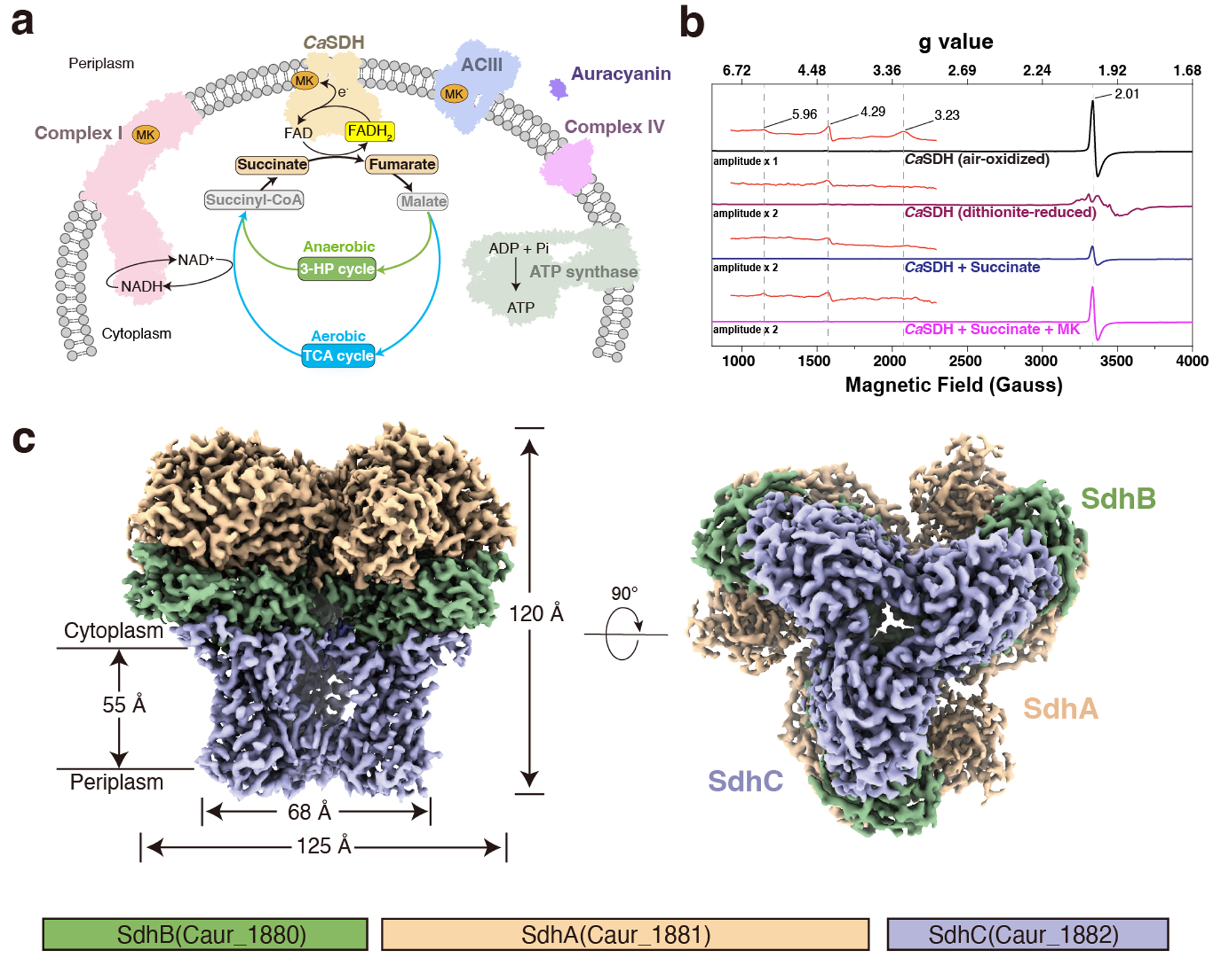 基于课题组前期对丝状不放氧光合细菌电子传递链和固碳机制的系统研究(Nat Commun 2018;Sci Adv 2020;eLife 2023;mBio 2023, 2024;Plant Commun 2024;Plant Cell 2024;Structure 2025;PNAS 2025),作者首先对内源提取的CaSDH进行活性测定,证实其具有琥珀酸:醌氧化还原酶和富马酸还原酶的双重催化活性。