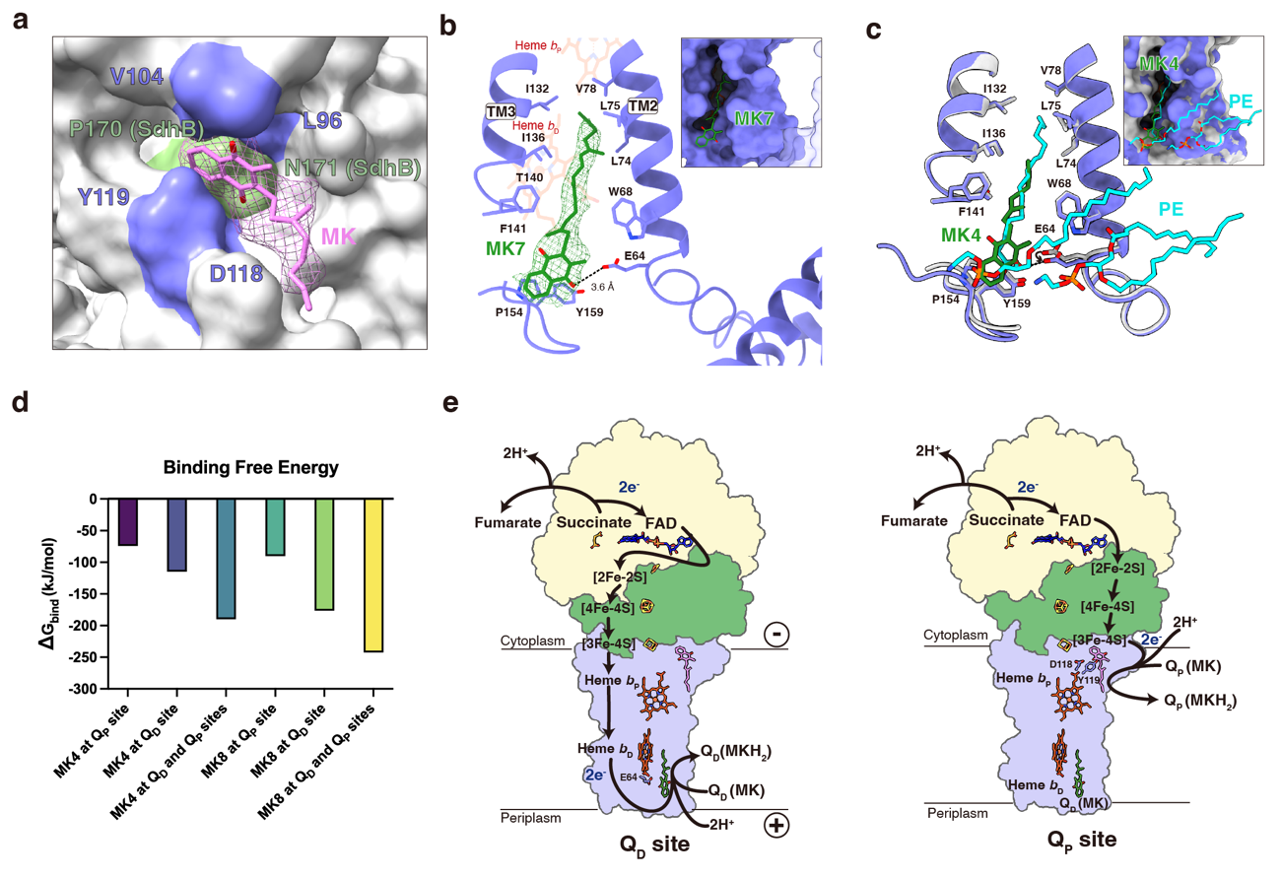 为了明确CaSDH的电子传递路径,作者通过电子顺磁共振(EPR)对金属中心的氧化还原状态进行表征,发现3个铁硫簇和2个b-型血红素均参与琥珀酸氧化和MK还原过程的电子传递。结合电子传递路径计算和酶活分析,作者提出MK分别在QP和QD位点发生还原的电子传递路径。CaSDH氧化琥珀酸释放出的电子依次经FAD、[2Fe-2S]、[4Fe-4S]传递,在[3Fe-4S]处发生分叉:从[3Fe-4S]传递至QP位点的MK通过Asp-C118和Tyr-C119发生还原;自[3Fe-4S]传出的电子经两个b型血红素传递至QD位点的Glu64,后者接受电子使MK还原,此电子传递过程需要跨膜质子梯度的驱动。分子动力学模拟(MD)显示,MK4和MK8在QD的结合自由能均低于QP,而MK8 较长的疏水尾巴增强与醌结合位点的亲和力。CaSDH两个醌位点的构象和亲和力差异,使其能够适应不同生理条件下细胞膜电位的变化(图2)。