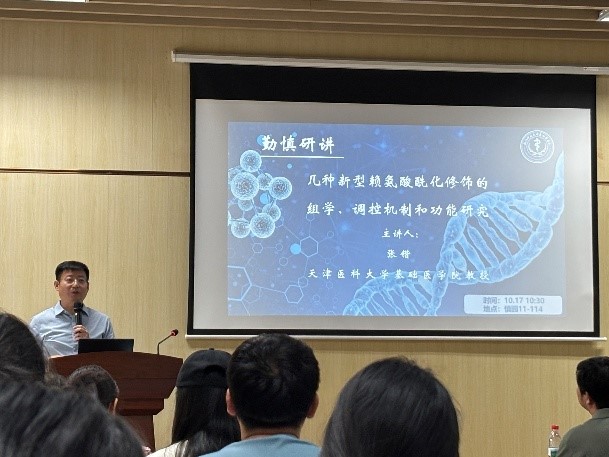 2025年10月17日上午,我院 “勤慎研讲” 研究生学术论坛第八讲在慎园 11-114 会议室顺利举办。本次讲座特邀天津医科大学基础医学院张锴教授担任主讲人,以 “几种新型赖氨酸酰化修饰的组学、调控机制和功能研究” 为主题,为在场师生带来一场聚焦前沿、兼具深度与实用性的学术分享。 作为全省医学表观遗传学重点实验室学术交流体系的重要组成部...