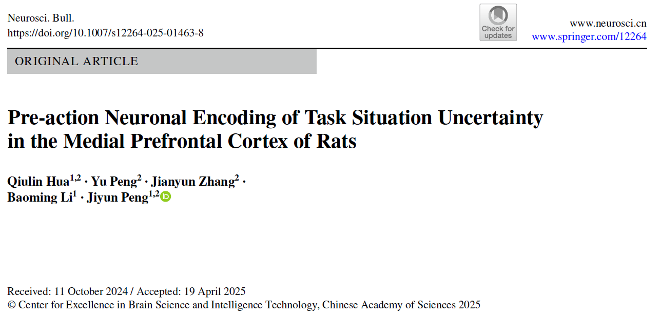2025年7月,脑科学研究所、基础医学院生理学系彭吉云教授课题组在神经科学TOP期刊Neuroscience Bulletin上发表了题为“Pre-action neuronal encoding of task situation uncertainty in the medial prefrontal cortex of rats”的研究。文章主要通过脑内神经元活动记录的手段,解读了大鼠在面临不确定的环境场景时,其脑内神经活动的变迁,以一种类似“读心术”的方法,发现大鼠具备通过历史经验,认知到环境场景中的不确定性的能力。