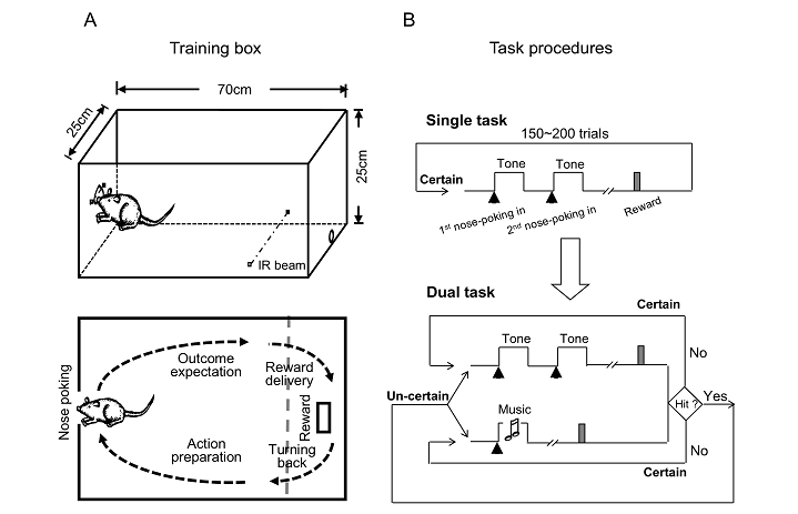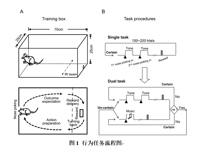 A)行为训练箱示意。探洞外设有红外线监测大鼠的探鼻行为,箱体靠后位置的红外线用于检测大鼠往返饮水区行为。B)任务流程设置,单一任务即确定的任务,大鼠需要做两次探鼻操作并成功触发声音反馈(Tone);双任务即不确定的任务,首次探鼻可能触发Tone或Music,大鼠需要根据反馈做或不做二次探鼻操作。