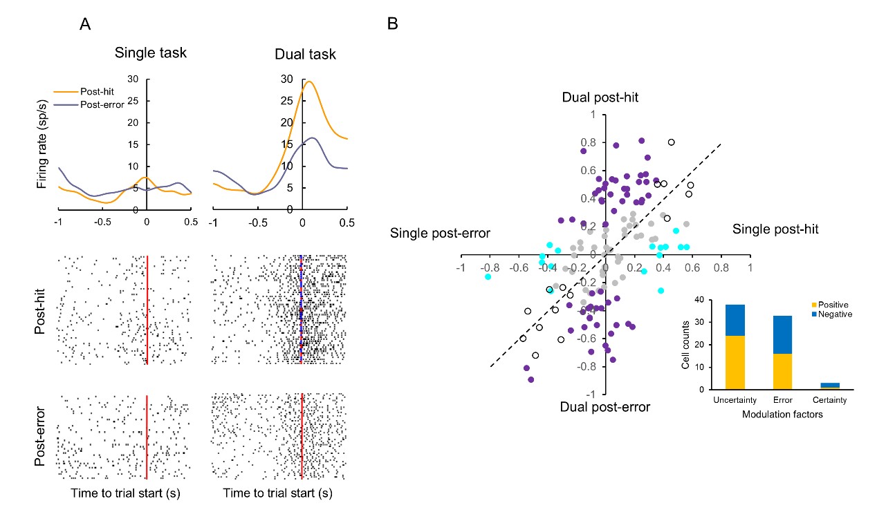 A)单个神经元反应示例。去确定的单一任务时,该神经元反应不受前次是否操作错误影响;在双任务阶段,当大鼠面临不确定的任务时,在任务启动前该神经元放电频率显著增高,且显著高于该阶段确定的纠错任务时的放电频率。B)内侧前额叶神经元在任务启动前的反应选择性群体分布图。在双任务阶段引入不确定性后,表现出显著反应差异的神经元(紫色圆点)数量显著多于其他情形,且除去错误操作引起的反应,绝大多少反应选择性可归因于不确定性的引入。