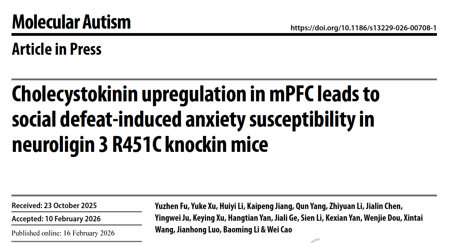 杭州师范大学基础医学院脑科学研究所李葆明教授、曹蔚副教授团队在Molecular Autism期刊发表题为“Cholecystokinin Upregulation in mPFC Leads to Social Defeat-Induced Anxiety Susceptibility in Neuroligin 3 R451C Knockin Mice”的研究论文。该研究系统解析了孤独症模型小鼠由社交挫败诱导的焦虑易感神经机制,为理解孤独症谱系障碍(ASD)伴发的焦虑症状及探索靶向干预策略提供了新的理论依据。