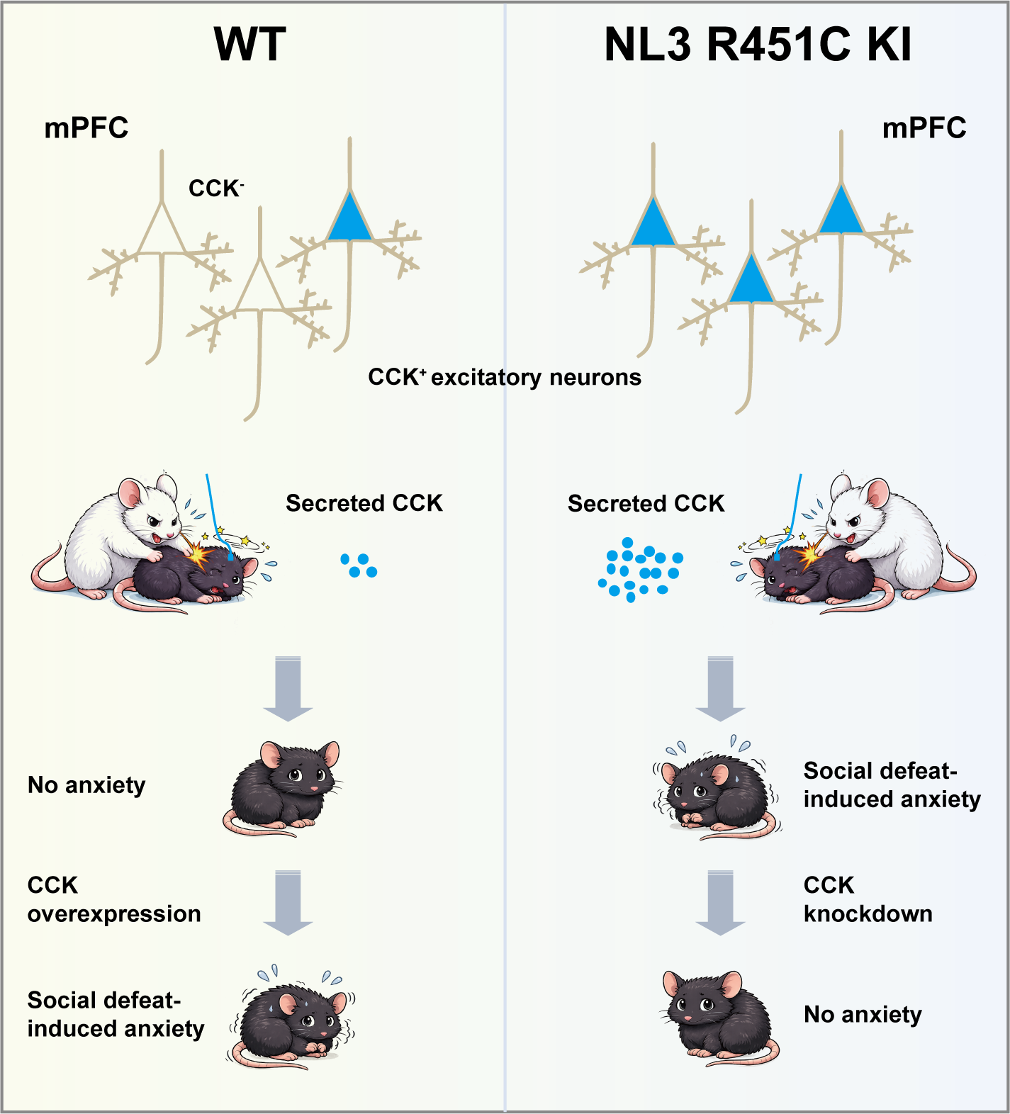 本文采用Neuroligin-3(NL3)突变(KI)ASD模型小鼠,这是一种经典的孤独症遗传模型,表现出典型的ASD行为特征,包括社交障碍、刻板行为和认知僵化。本研究揭示了mPFC中CCK信号上调是ASD模型小鼠应激诱导的焦虑易感性增加的神经机制(图1)。