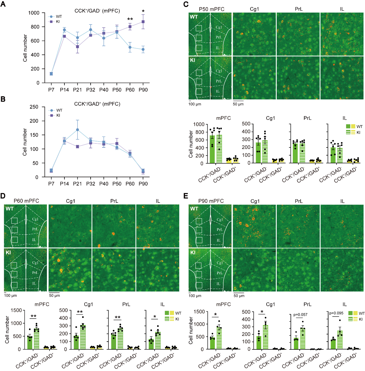 图2:成年突变小鼠mPFC中CCK阳性兴奋性神经元数量增加