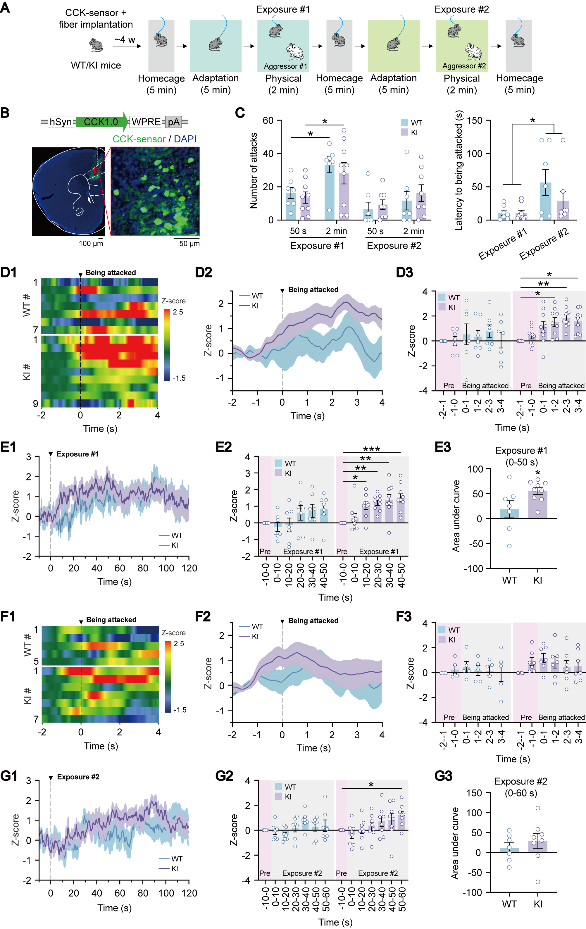 我们的研究发现,成年突变小鼠mPFC中CCK阳性兴奋性神经元的数量显著且持续增加,这一发育性偏差在野生型(WT)对照组中未观察到(图2)。尽管成年突变小鼠基线状态下未表现明显的焦虑样行为,但其对SDS诱导的焦虑表现出更高易感性(图3)。光纤记录显示,KI小鼠在遭受攻击时mPFC中CCK分泌显著异常增加并持续,而WT小鼠未出现此现象(图4)。关键是,靶向敲低成年突变小鼠mPFC兴奋性神经元中的Cck可减轻焦虑易感,而在成年WT小鼠中过表达Cck则足以诱发焦虑易感。